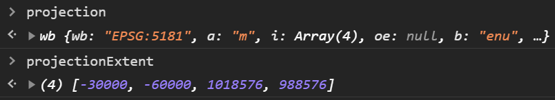 크롬의 Console에서 변수를 쳐 보았을때 EPSG:5181의 좌표계를 사용하는 것으로 확인된다.