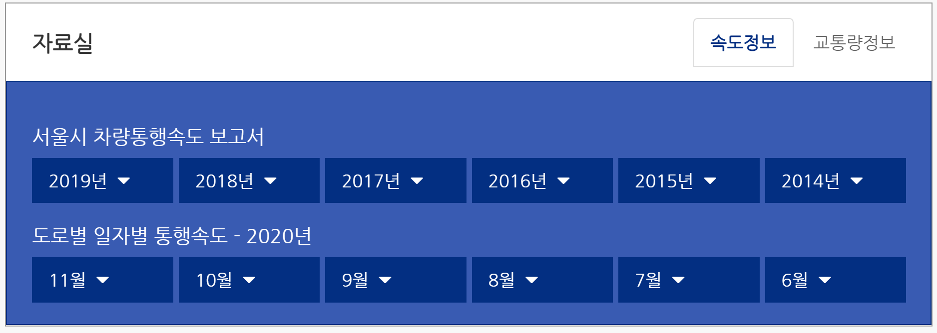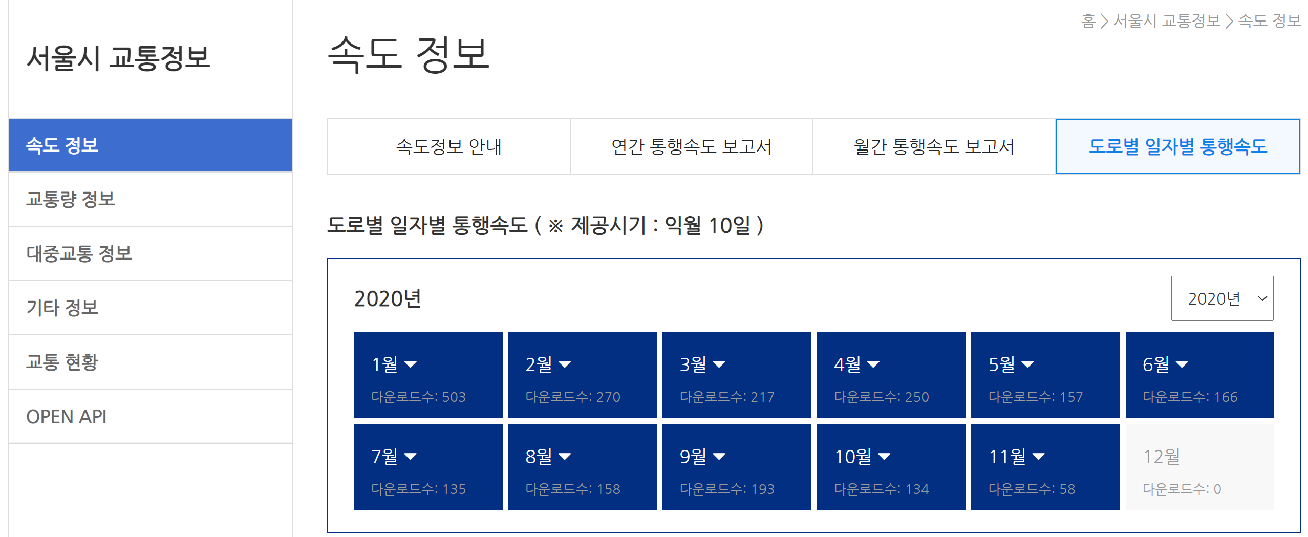 속도정보 탭에서 다음과 같이 다운로드 할 수 있다. 데이터 정제 과정을 생략하여 현재 GitHub(github.com/cdsnlab/SeoulTrafficData) 에서 데이터 열람이 가능하다. TOPIS에서는 기타 정보 > 기반 정보 에서 서울시 표준링크 매핑정보를 활용하여 ITS 표준노드링크정보 (nodelink.its.go.kr/)에서 데이터를 구하여 매핑하여 활용하는 것을 기대한 것으로 보이나, TOPIS 지도에 나와있는 데이터와는 달리 매핑이 완전하지 않아 데이터가 소실되기도 하였다.