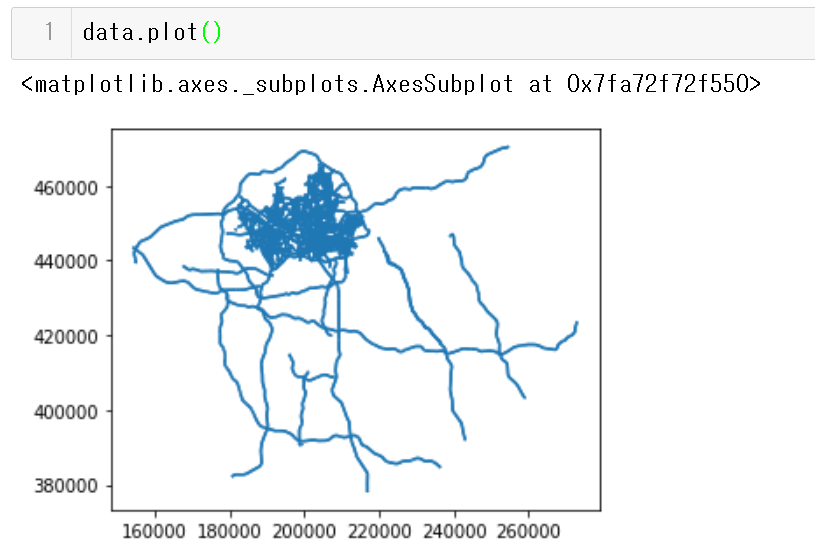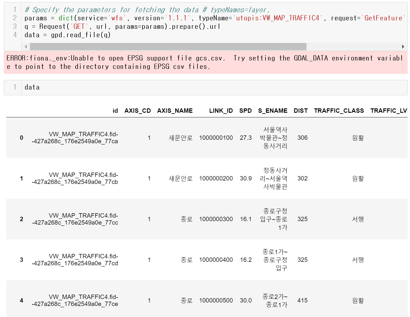 다음과 같이 parameter를 설정하여 GeoDataFrame 형태의 data를 얻어내었다. 참고로 WFS의 파라미터 설정은 다음의 페이지를 참조하여 하면 된다: docs.geoserver.org/stable/en/user/services/wfs/reference.html. 본 글에서는 geojson의 형태의 데이터로 geopandas로 데이터를 읽기 위해 outputFormat='application/json'을 택하였으며, typeName은 layer 이름을 넣으면 된다.