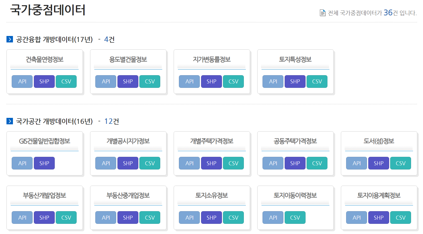 국가중점데이터 전체 국가중점데이터가 36건 입니다. 공간융합 개방데이터(17년) - 4건 API SHP CSV API SHP CSV API SHP CSV API SHP CSV 국가공간 개방데이터(16년) - 12건 API SHP API SHP CSV API SHP CSV AP
