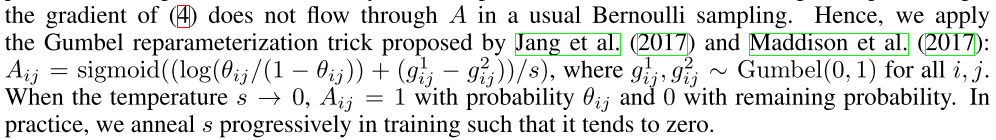 논문에서는 When the temperature s → 0, Aij = 1 with probability θij and 0 with remaining probability. In practice, we anneal s progressively in training such that it tends to zero.
