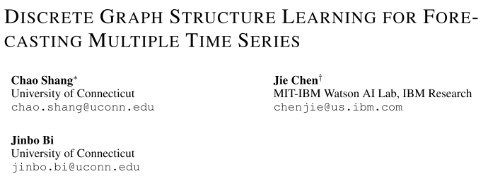 Shang, Chao, Jie Chen, and Jinbo Bi. "Discrete Graph Structure Learning for Forecasting Multiple Time Series." arXiv preprint arXiv:2101.06861 (2021).