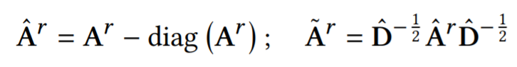 Diagonal 부분을 제거한 Ar을 Row normalize된 형태로 준비 한뒤... (However, we notice that A 𝑟 is a diagonal-dominant matrix, describing a graph with self-loops much stronger than any other connection. As self-loops usually hamper the propagation across adjacent nodes in message passing, 즉 message passing을 할때 self loop를 가장 많이 발생시키므로 제외했다고 한다.)